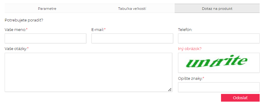 Tento kontaktný formulár nájdete pri každom produkte na webe. Ak sa teda pozeráte na svojho favorita a váhate s veľkosťou, či potrebujete poradiť s niečím iným, pod popisom produktu nájdete 3 záložky: "Parametre", "Tabuľka veľkostí" a "Dotaz na produkt". Po kliknutí na záložku "Dotaz na produkt" sa vám zobrazí kontaktný formulár, ktorý len vyplníte a naša zákaznícka linka vás bude kontaktovať.