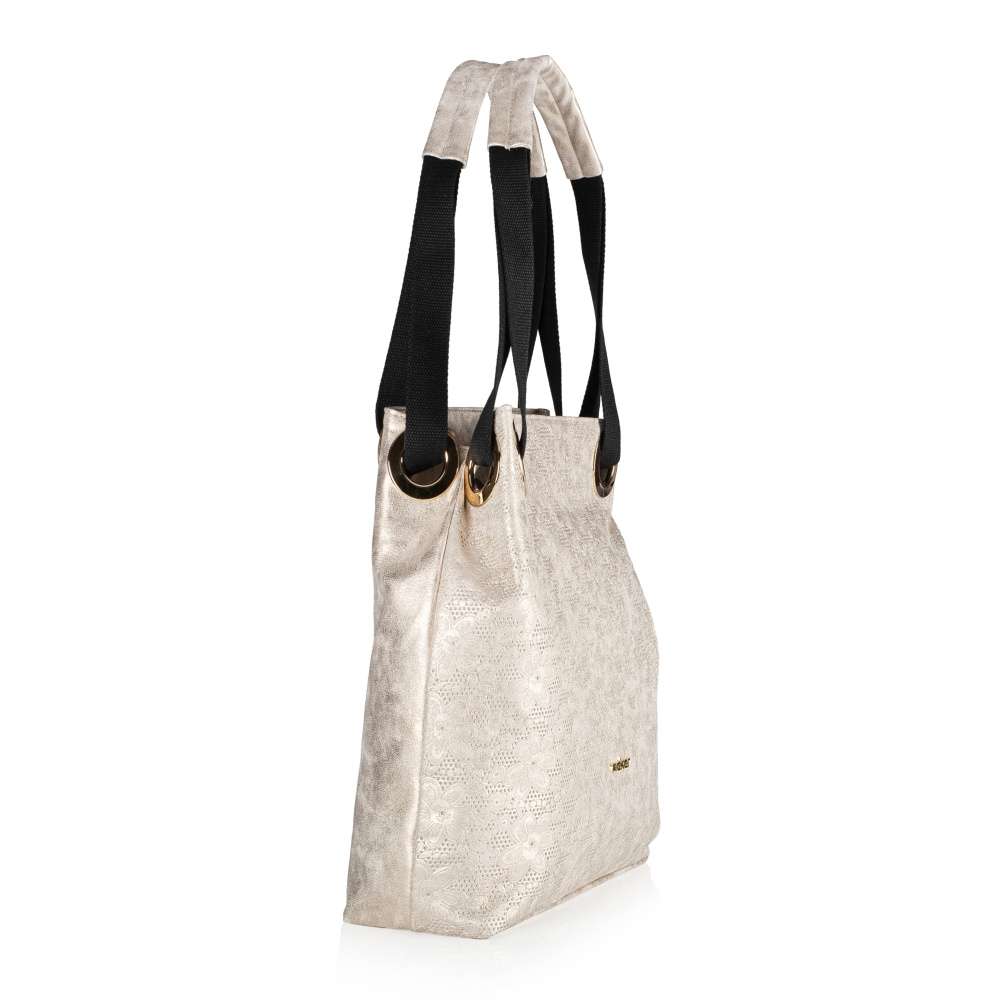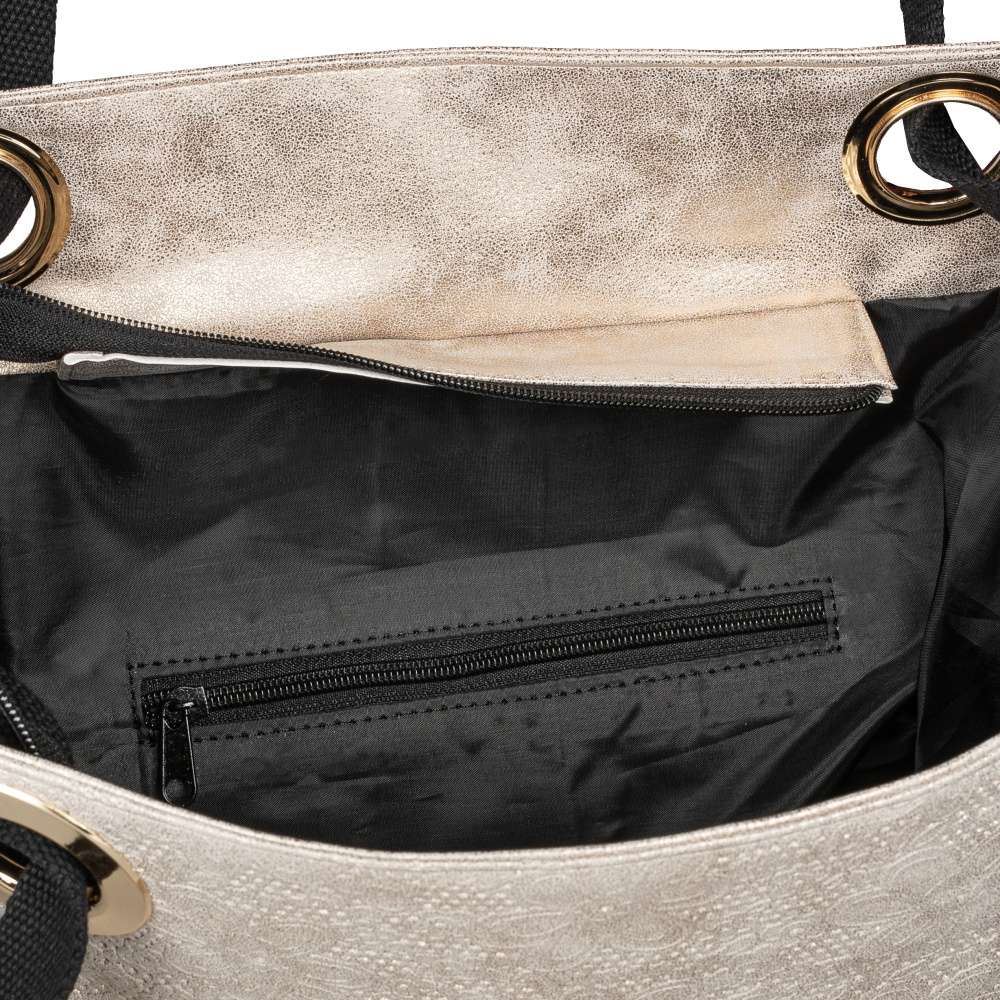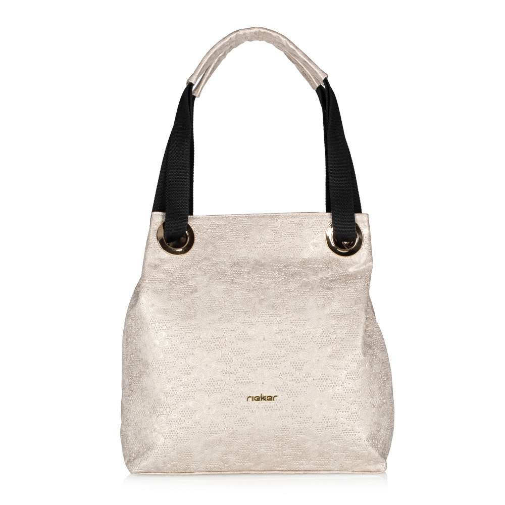 Táto dámska kabelka s odleskami zlatej farby od značky Rieker zaujme predovšetkým vzorom kvetín. Ozdobným prvkom sú tu aj kovové zlaté krúžky s prevlečenými ušami. Zo zadnej strany Vás určite poteší malé vrecko slúžiace na uloženie rôznych drobností. Uzatvára sa zipsom, po ktorého rozopnutí sa Vám ponúka jedno veľké vrecko s dvoma malými na mobil alebo kľúče. Má dva úchyty, ktoré sú vypolstrované a bude sa tak pohodlne nosiť. Krásne doplní Vaše outfity, preto neváhajte, a doprajte si tento skvelý kúsok. Rozmery: cca v 34 cm x š 33 cm Vnútorné usporiadanie: kabelka nie je delená