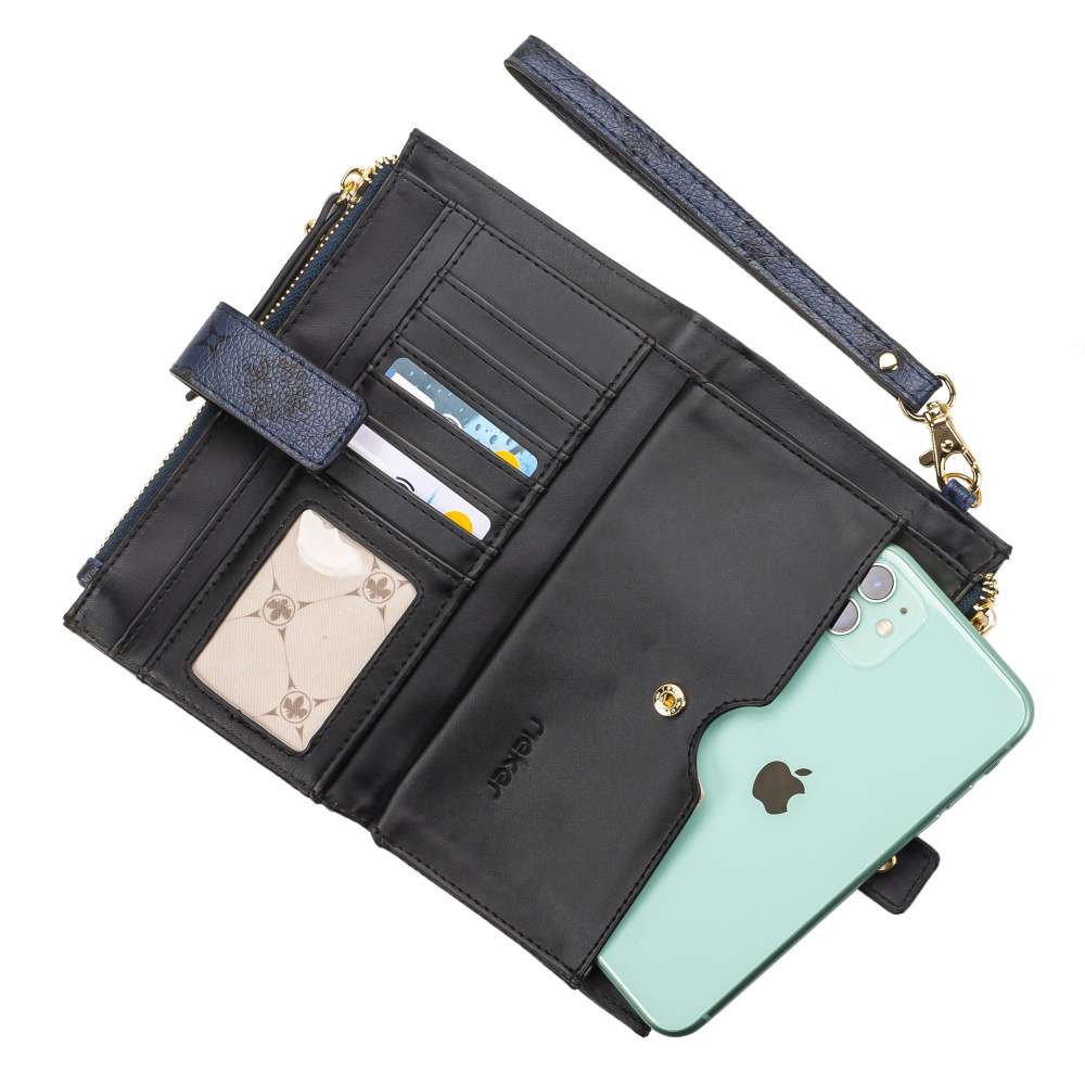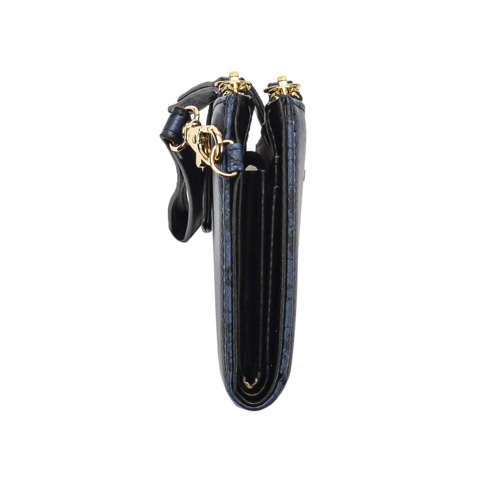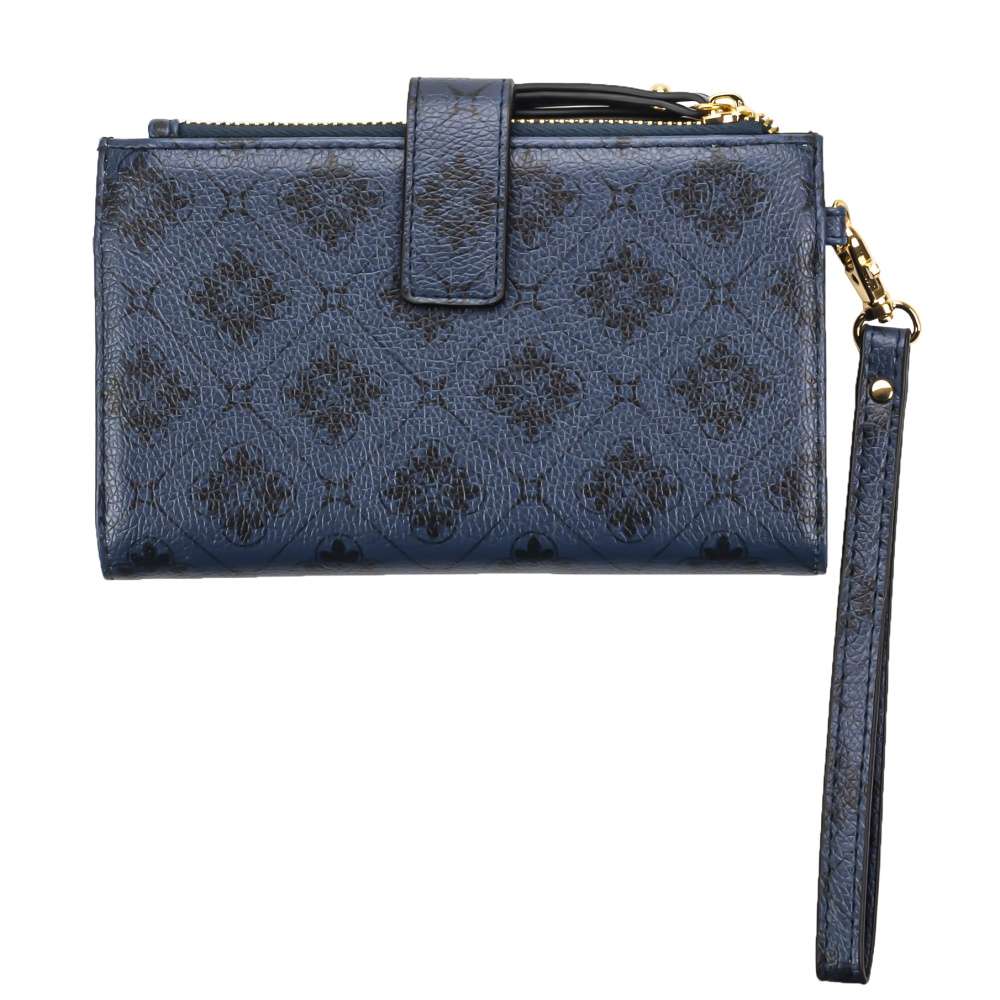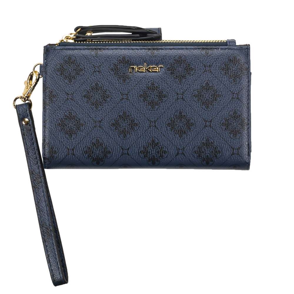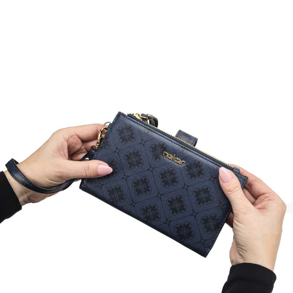 Túto dámsku peňaženku značky RIEKER si obľúbite vďaka praktickému prevedeniu. Zvršok tmavo modrej farby je dozdobený štýlovým vzorom, zlatistým nápisom a odopínateľným pútkom. Peňaženka má dve vrecká zapínateľné zipsom a celkovo sa uzatvára pásikom s cvokom. Po roztvorení peňaženky je možné vidieť niekoľko ďalších kapsičiek na karty, mobilný telefón alebo pozdĺžne priehradky na bankovky. Tento krásny model sa rozhodne stane vašim obľúbeným doplnkom pre každodenné používanie. Rozmery: cca v 12 cm x š 18,5 cm x h 3 cm