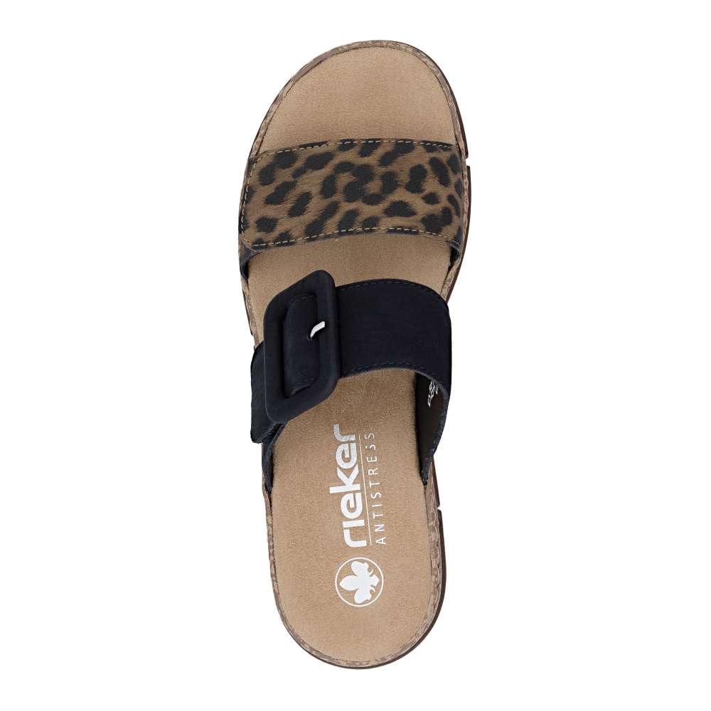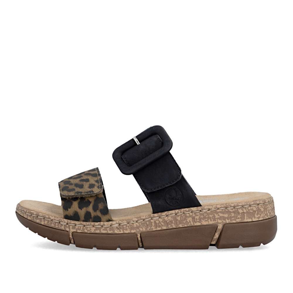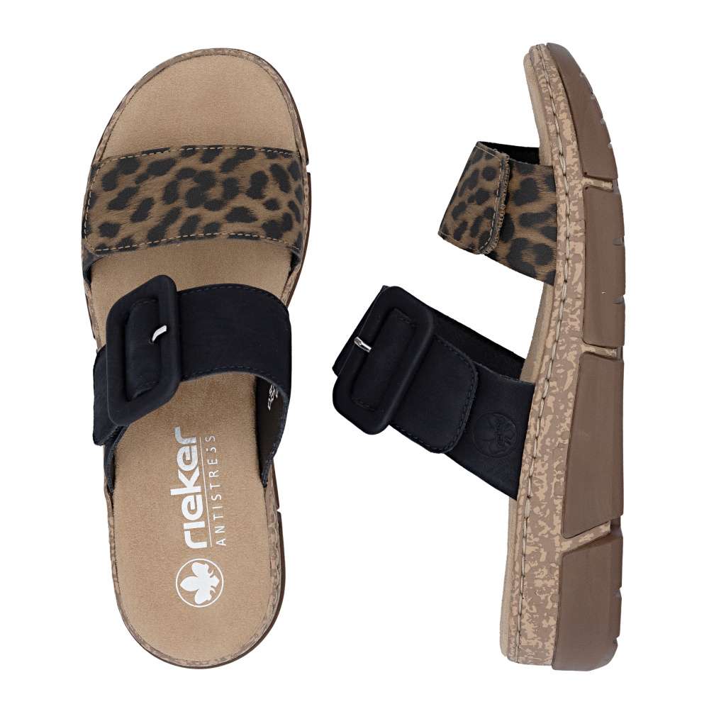 Originálny vzhľad týchto šľapiek RIEKER vytvárajú dva pásiky vo výraznom kontraste – jeden v béžovom prevedení je doplnený výraznou sponou, druhý prináša odvážny zvierací motív, ktorý dodáva modelu módny akcent. Oba pásiky sú vybavené praktickým suchým zipsom, vďaka ktorému si obuv jednoducho prispôsobíte podľa tvaru svojho chodidla. Príjemná textilná stielka zabezpečuje komfort pri došliapnutí a spríjemní každý krok. Výrazným dizajnovým prvkom je aj nárazy tlmiaca podošva s klinovým podpätkom, ktorá poskytuje stabilitu, pohodlie a zároveň jemne zvýrazní ženskú siluetu. Tieto šľapky sú ideálnou voľbou pre ženy, ktoré chcú spojiť módny vzhľad a pohodlie v jednom štýlovom letnom modeli. Technológia: Antistress – vďaka štyrom antistresovým vlastnostiam – ľahkosti, pružnosti, priestrannosti a vynikajúcej absorpcii nárazov – vám topánky RIEKER ponúknu komfortnejšiu chôdzu.