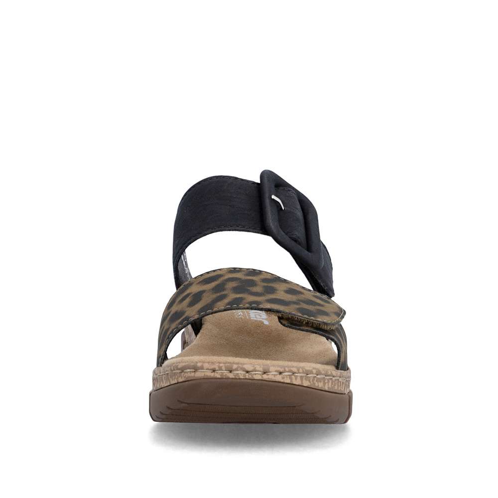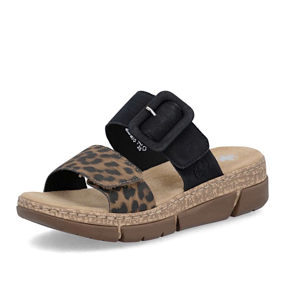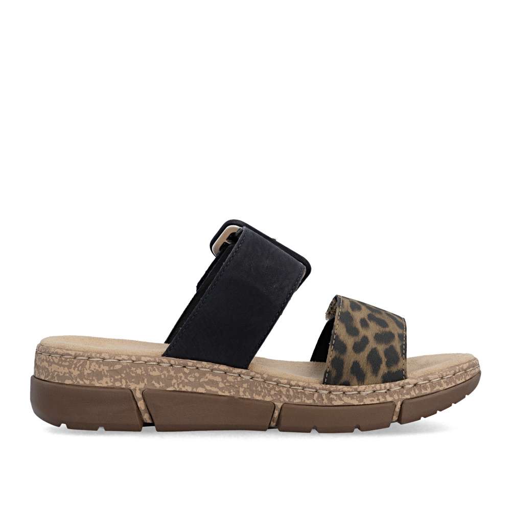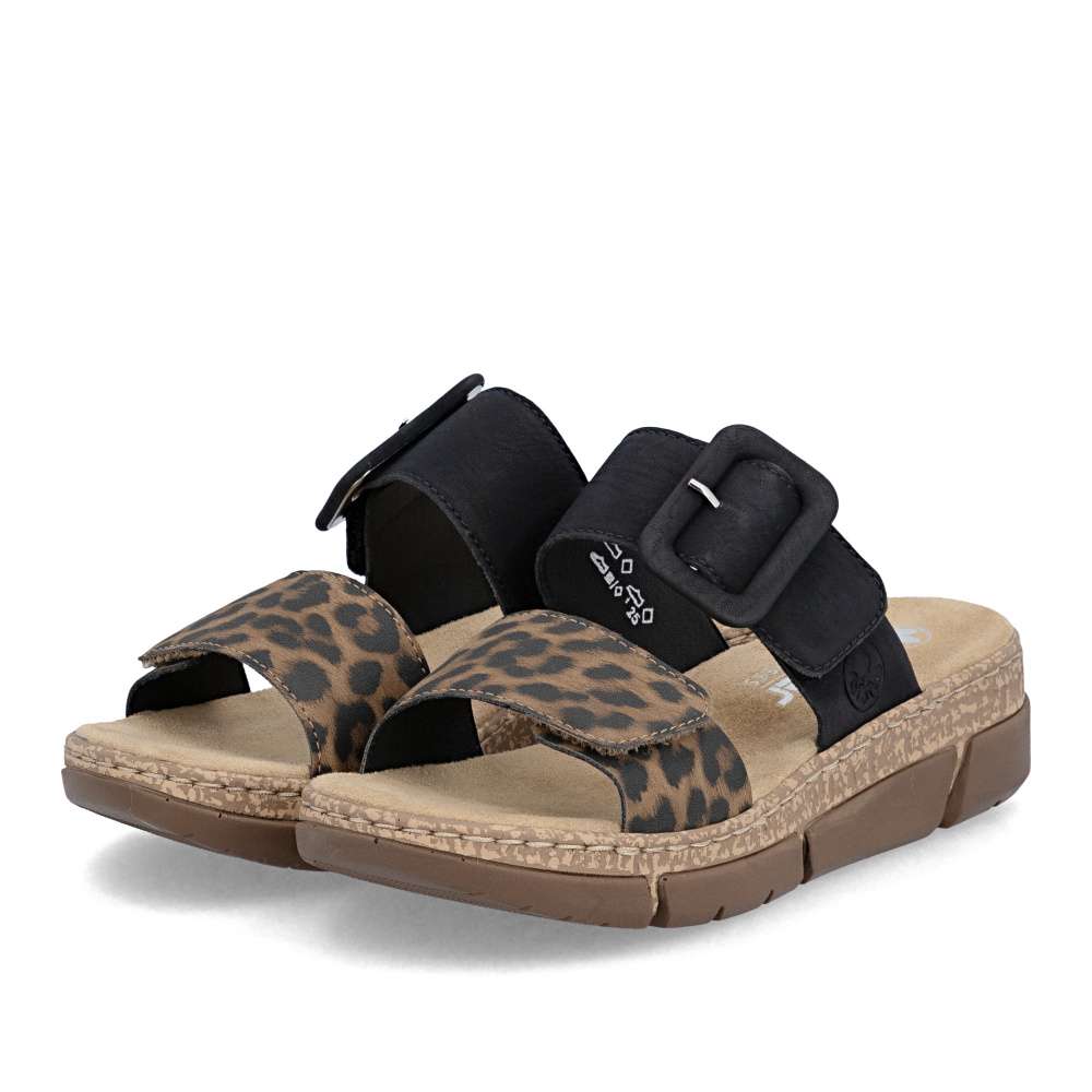 Originálny vzhľad týchto šľapiek RIEKER vytvárajú dva pásiky vo výraznom kontraste – jeden v béžovom prevedení je doplnený výraznou sponou, druhý prináša odvážny zvierací motív, ktorý dodáva modelu módny akcent. Oba pásiky sú vybavené praktickým suchým zipsom, vďaka ktorému si obuv jednoducho prispôsobíte podľa tvaru svojho chodidla. Príjemná textilná stielka zabezpečuje komfort pri došliapnutí a spríjemní každý krok. Výrazným dizajnovým prvkom je aj nárazy tlmiaca podošva s klinovým podpätkom, ktorá poskytuje stabilitu, pohodlie a zároveň jemne zvýrazní ženskú siluetu. Tieto šľapky sú ideálnou voľbou pre ženy, ktoré chcú spojiť módny vzhľad a pohodlie v jednom štýlovom letnom modeli. Technológia: Antistress – vďaka štyrom antistresovým vlastnostiam – ľahkosti, pružnosti, priestrannosti a vynikajúcej absorpcii nárazov – vám topánky RIEKER ponúknu komfortnejšiu chôdzu.