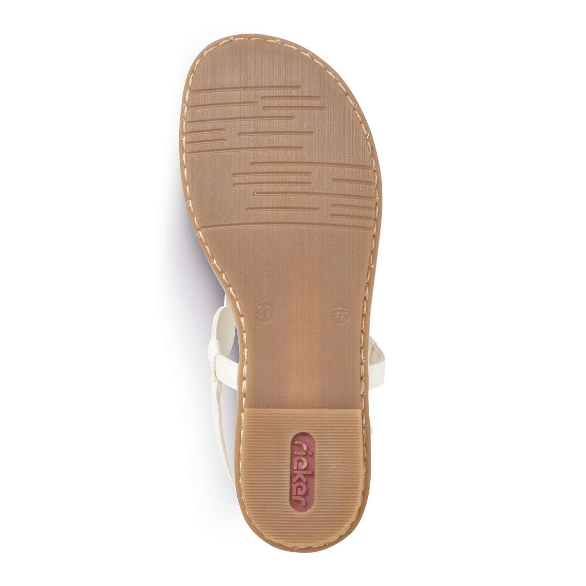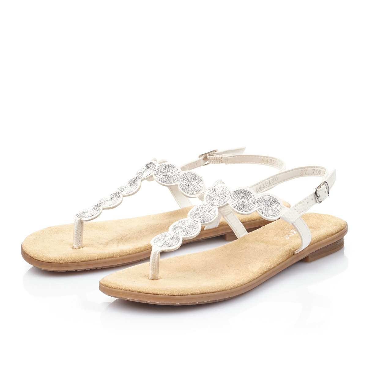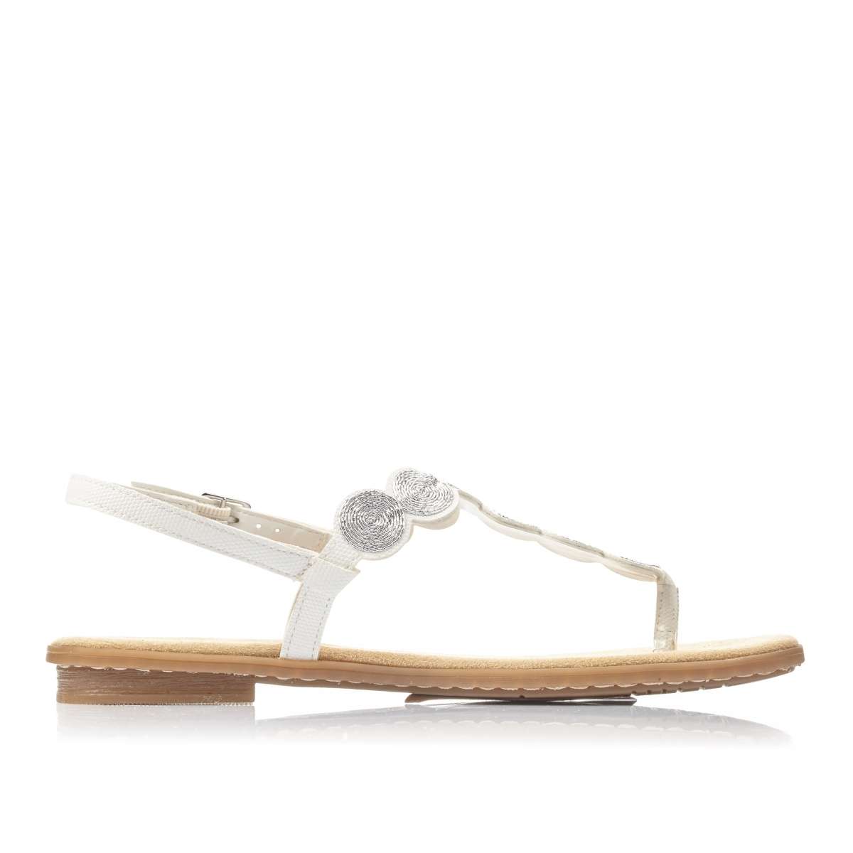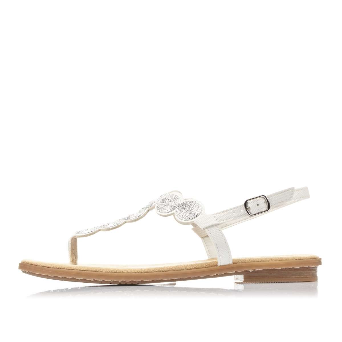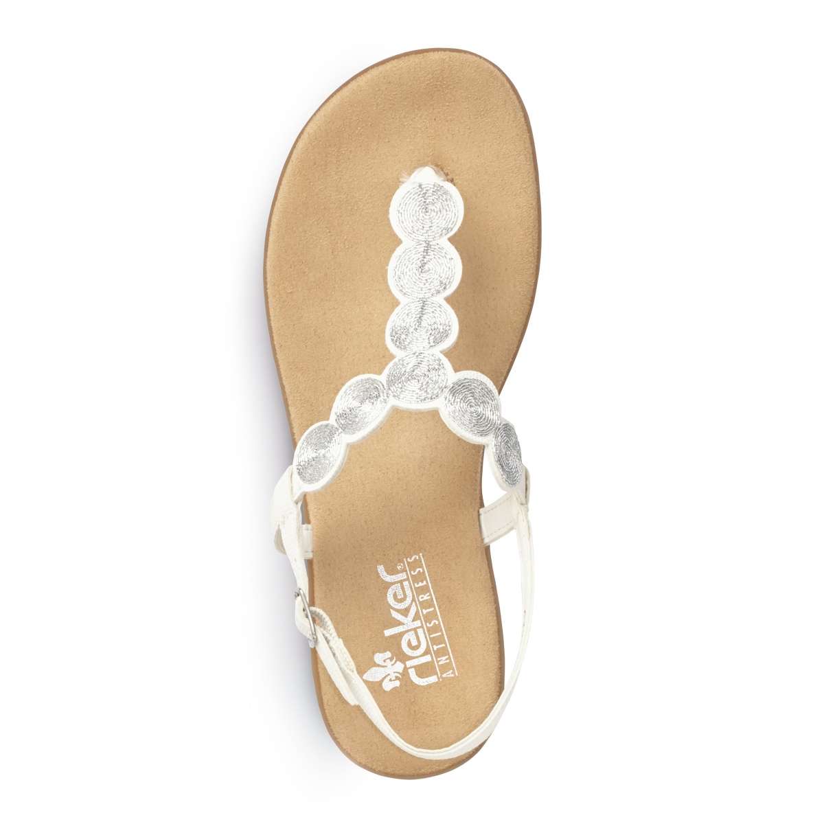 Sandálky žabkového štýlu značky RIEKER. Biela farba a zdobenie priehlavku v podobe strieborných krúžkov pôsobí zaujímavým dojmom, preto ich s ľahkosťou doladíte k akémukoľvek letnému outfitu. O upevnenie k nohe sa postará remienok okolo členku. Môžete si ich vziať na rozličné príležitosti. Tieto žabky nie sú iba krásne, ale aj pohodlné. Technológia: Antistress - podošva je vďaka tejto technológii ľahká, flexibilná, absorbuje nárazy pri došliapnutí a ľahko sa prispôsobí každej nohe.