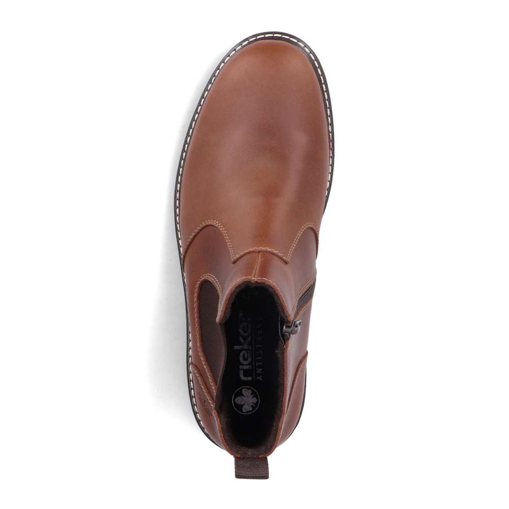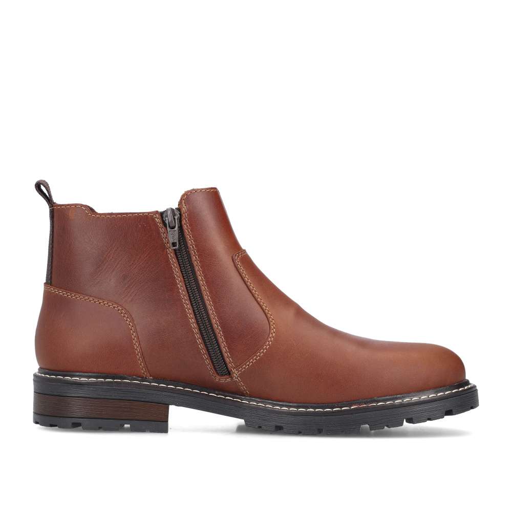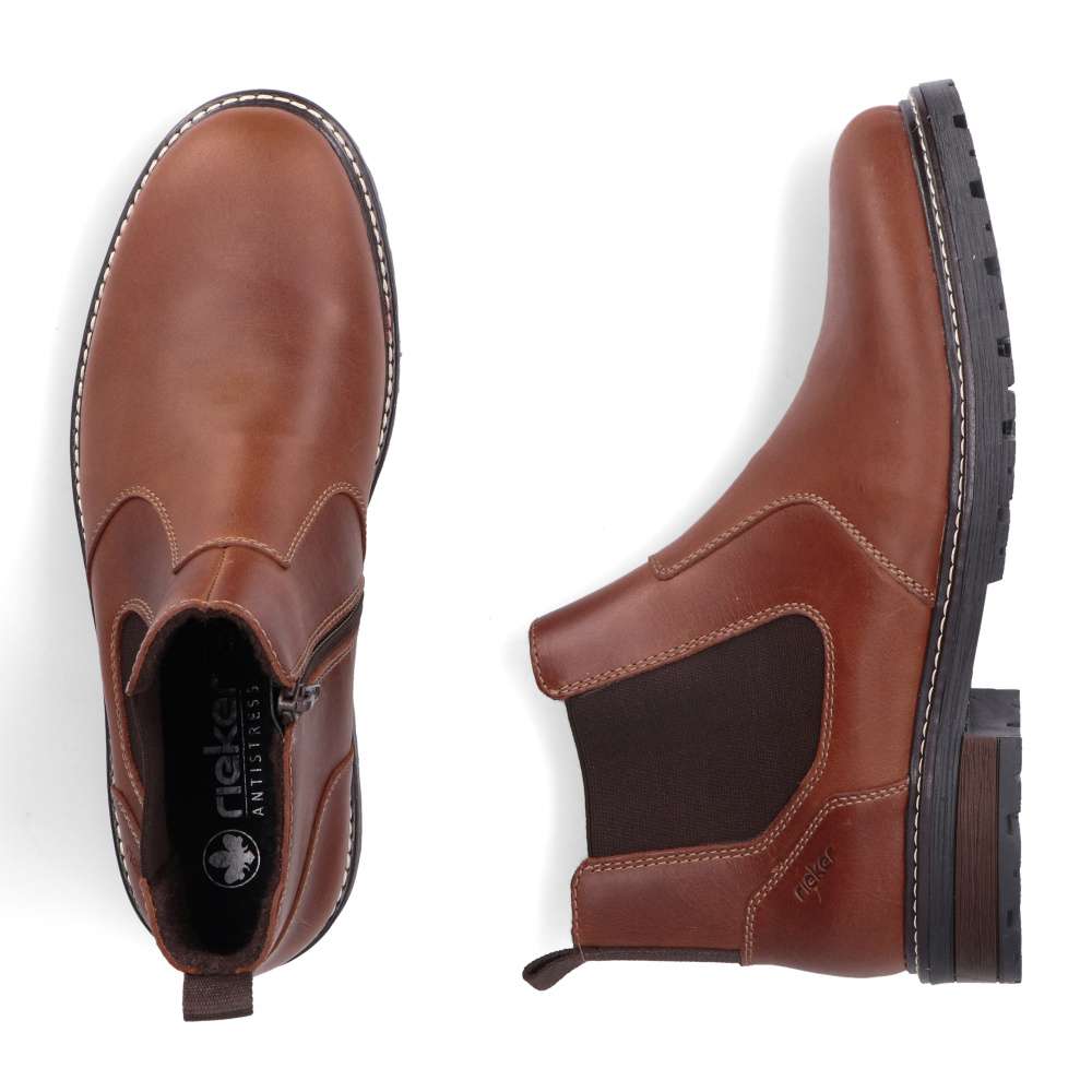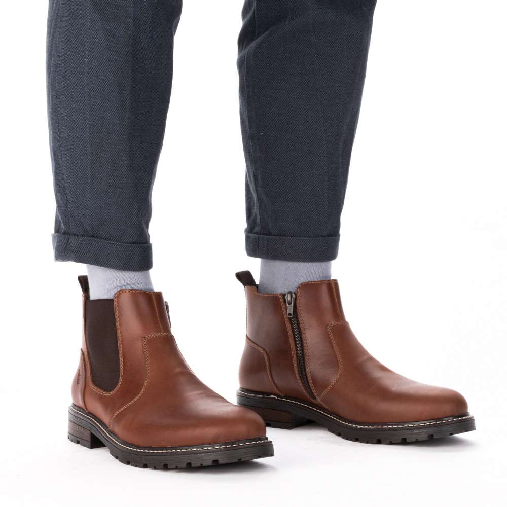 Tieto členkové topánky RIEKER sú skvelou voľbou pre mužov preferujúcich štýlový vzhľad a pohodlie v jednom. Hnedý kožený zvršok dopĺňa pružná časť z vonkajšej časti topánky a zips z vnútornej časti, ktoré uľahčujú obutie a zároveň sa prispôsobia tvaru nohy. Vnútorná textilná podšívka a podošva tlmiaca nárazy ponúka pohodlie počas celého dňa. Vďaka univerzálnemu dizajnu ich bez problémov skombinujete s džínsami aj nohavicami pre každý bežný deň v znamení nadčasového štýlu a dokonalého pohodlia. Technológia: Antistress – vďaka štyrom antistresovým vlastnostiam – ľahkosti, pružnosti, priestrannosti a vynikajúcej absorpcii nárazov – vám topánky RIEKER ponúknu komfortnejšiu chôdzu.